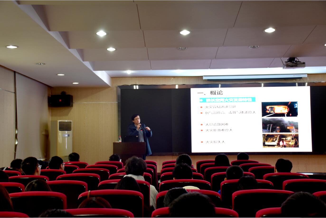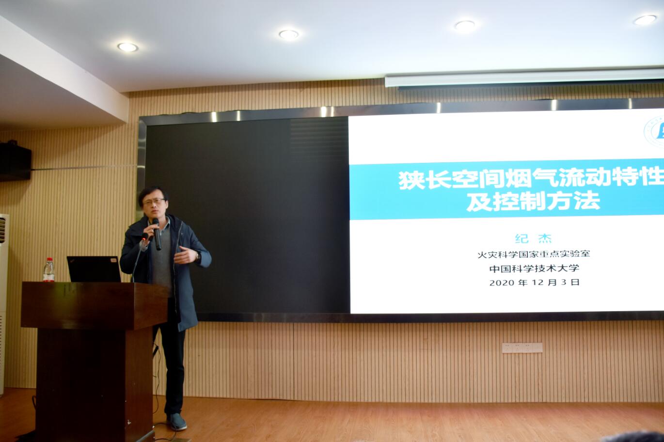 纪杰教授的报告围绕“狭长空间烟气流动特性及控制方法”开展。首先,他简述了狭长受限空间典型火灾案例与的分类,并重点讲解了隧道火灾这一典型狭长受限空间的主要研究方法。其次,基于近年来的研究,剖析了隧道火灾羽流与烟气蔓延行为、壁面的影响效应、火焰尺度、温度和有毒气体浓度的演化表征模型。此后,基于实际隧道的工程应用,对城市地下公路隧道自然排烟、机械排烟有效性、低压环境隧道烟气输运特征进行了详细介绍。最后,结合现阶段的研究,提出了基于数据同化的隧道火灾发展预测方法的前沿科学挑战。会后,纪杰教授与参会师生展开了隧道火灾学术交流,并由罗学东副经理对报告会进行了总结发言。