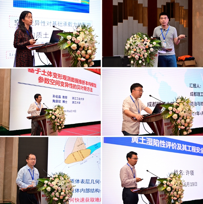 会议期间,各位专家学者以目前各自所属的专业方向及具体研究成果为主要内容,为线下线上参会人员作了精彩的学术报告。威廉希尔WilliamHill(武汉)唐辉明教授以《基于演化的滑坡防控理论与方法技术》为题作会议特邀报告,美国克莱姆森大学C. Hsein Juang教授在线上作《地质/地层/岩土模型不确定性的量化及影响评价》的特邀报告,同济大学黄宏伟教授以《工程风险管控存在的问题与适应性风险管理》为题作特邀报告,武汉大学李典庆教授以《Copula理论在岩土工程不确定性与可靠性分析中应用进展》为题作特邀报告,重庆大学周小平教授以《场富集有限元法及其应用》为题作特邀报告,中国大地保险张帆总经理应邀以《IDI的实践与思考》为题作特邀报告。