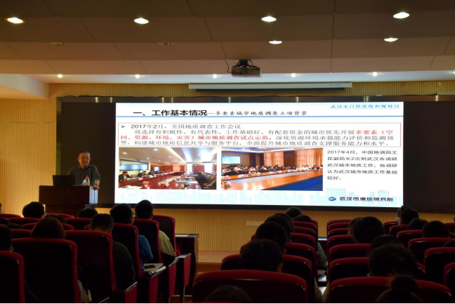 随后,彭汉发教授级高级工程师以《武汉城市地质调查成果与应用》为题,介绍了多要素地质调查的必要性,总结了武汉市前期多要素地质调查挑战与难题,简要概括了其实现途径与进展现状,结合多要素地质调查成果分析了其实践应用。武汉多要素地质调查精准对接城市发展需求,提出解决城市问题和保障城市高质量发展的对策建议;结合大数据、云计算、GIS等先进技术,将调查成果融入城市管理主流程,充分发挥地质工作的支撑作用,服务于城市规划建设和可持续发展。此外,彭汉发教授介绍了武汉市测绘研究院在武汉市城市多要素地质调查未来五到十年的目标规划以及对人才的迫切需求,他希望公司能够继续为武汉市测绘研究院输送高质量的地质、资源、环境等学科人才,双方在校企合作方面深度融合,共同培养实践型人才。
