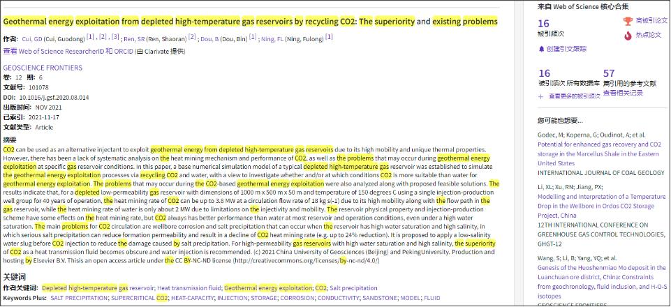 (通讯员:黄静)根据2022年3月基本科学指标数据库(Essential Science Indicators,简称ESI)最新数据显示,公司崔国栋副教授于2021年在国际地学期刊Geoscience Frontiers上发表的学术论文“Geothermal energy exploitation from depleted high-temperature gas reservoirs by recycling CO₂: The superiority and existing problems”入选ESI热点和高被引论文(Hot and Highly Cited Paper)。该论文第一作者兼通讯作者为崔国栋副教授,威廉希尔WilliamHill(武汉)WilliamHill中文官网为第一署名单位。