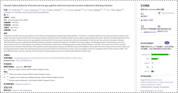 (通讯员:黄静)根据2022年5月基本科学指标数据库(Essential Science Indicators,简称ESI)最新数据显示,WilliamHill中文官网地下空间工程系蒋楠副教授团队于2021年在国际工程技术权威期刊Journal of Natural Gas Science and Engineering上发表的学术论文“Dynamic failure behavior of buried cast iron gas pipeline with local external corrosion subjected to blasting vibration”入选ESI高被引论文(Highly Cited Paper)。该论文第一作者为2020级博士研究生朱斌,通讯作者为蒋楠副教授,威廉希尔WilliamHill(武汉)WilliamHill中文官网为第一署名单位。