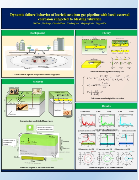 复杂环境邻近天然气管道爆破工程建设中,确保运营期天然气管道的安全稳定是工程重点关注内容。基于全尺寸埋地天然气管道爆破现场实验,结合运营年限时间尺度的埋地管道腐蚀程度精细刻画,建立了运营期不同腐蚀程度的管道爆破动力数值计算模型,描述了爆破振动作用下管道动力响应力学行为,揭示了爆破振动作用下天然气管道主控失效模式,提出了考虑运营年限的管道爆破振动安全控制阈值。研究成果对于丰富爆破安全规程、管道工程安全控制及评估方法具有重要的理论及实际应用价值。