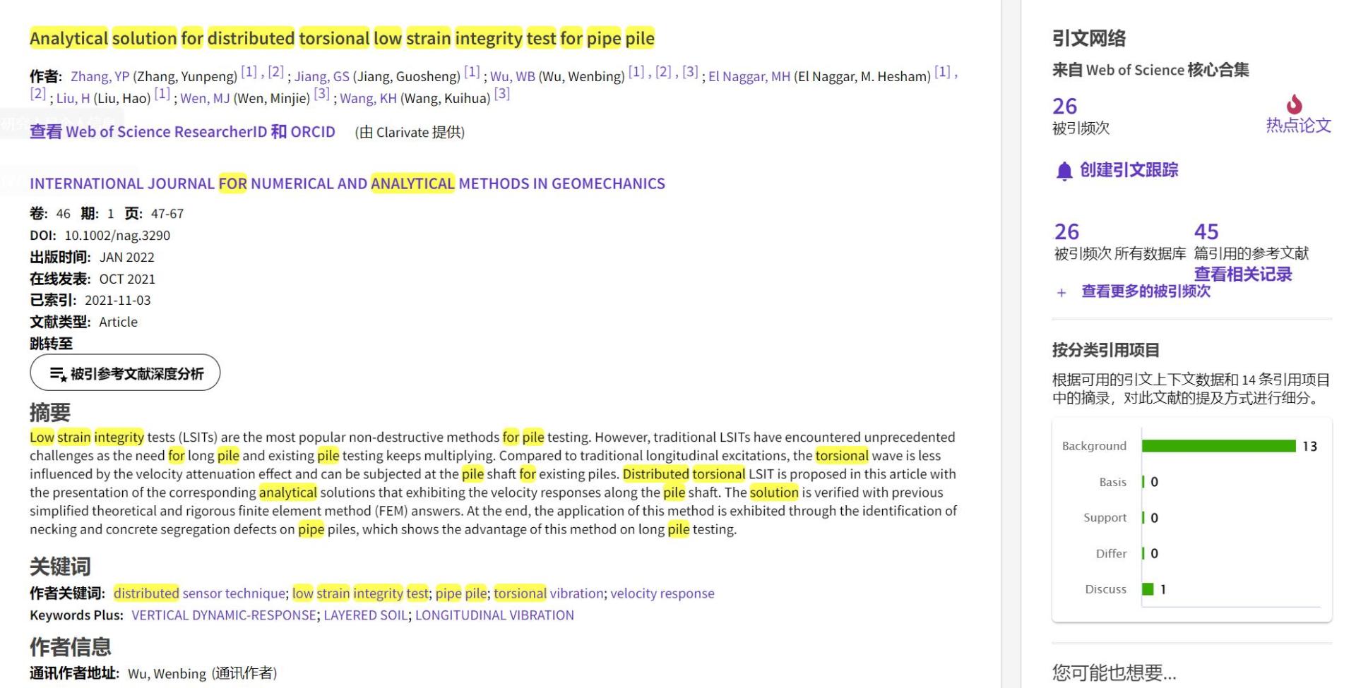 (通讯员 黄静)根据2022年9月基本科学指标数据库(Essential Science Indicators,简称ESI)最新数据显示,WilliamHill中文官网勘察与基础工程系吴文兵教授团队于2021年在国际岩土工程数值计算权威期刊International Journal for Numerical and Analytical Methods in Geomechanics上发表的学术论文“Analytical solution for distributed torsional low strain integrity test for pipe pile”入选ESI热点论文(Hot Paper)。该论文第一作者为2020级博士研究生张云鹏,通讯作者为吴文兵教授,威廉希尔WilliamHill(武汉)WilliamHill中文官网为第一署名单位。
