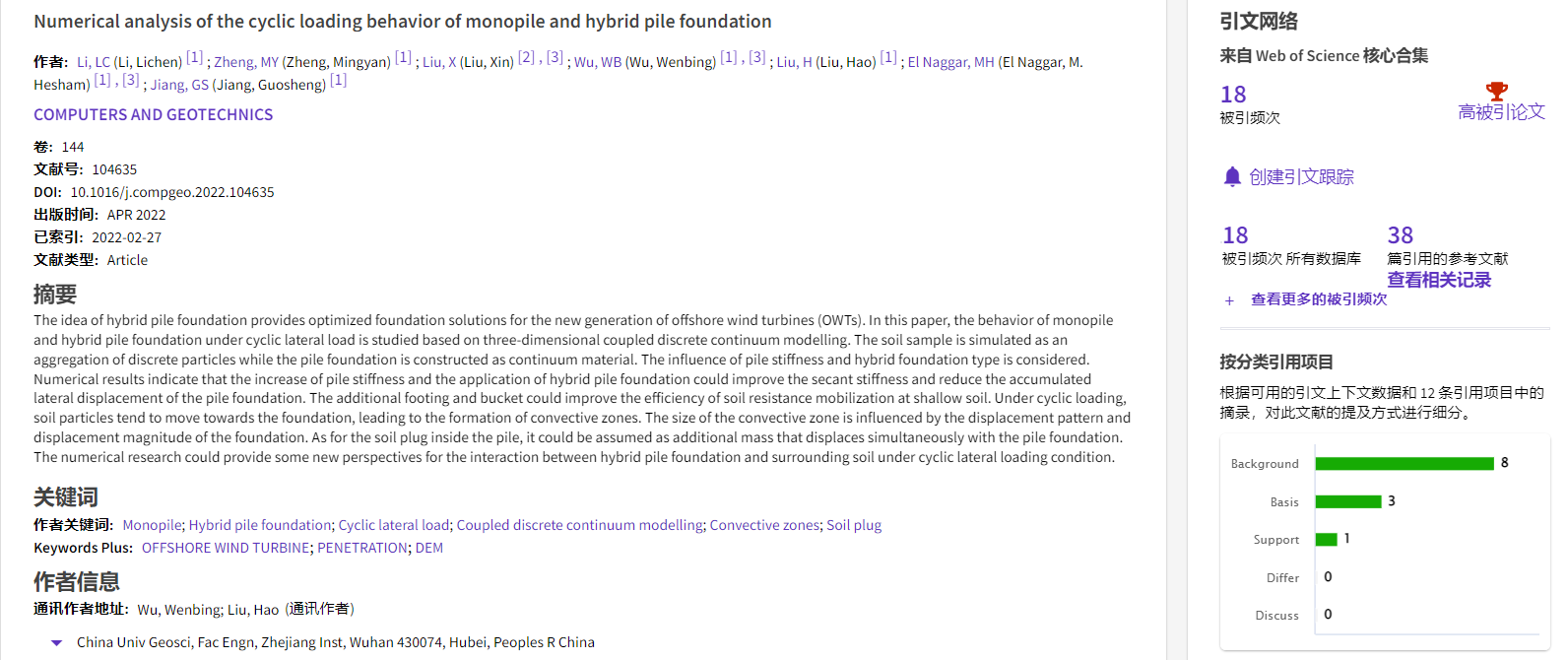 根据2022年11月基本科学指标数据库(Essential Science Indicators,简称ESI)最新数据显示,WilliamHill中文官网勘察与基础工程系吴文兵教授团队于2022年在国际岩土工程数值模拟权威期刊Computers and Geotechnics上发表的学术论文“Numerical analysis of the cyclic loading behavior of monopile and hybrid pile foundation”入选ESI高被引论文。该论文第一作者为勘察与基础工程系博士后李立辰,通讯作者为吴文兵教授,威廉希尔WilliamHill(武汉)WilliamHill中文官网为第一署名单位。