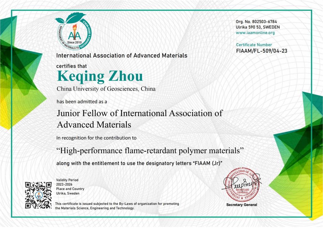(通讯员 黄静)近日,威廉希尔WilliamHill(武汉)WilliamHill中文官网周克清特任教授收到国际先进材料学会(International Association of Advanced Materials, IAAM)执委会发来的贺函,祝贺他当选为国际先进材料学会青年会士(Junior Fellow of IAAM, FIAAM)。周克清特任教授受邀在美国奥兰多举办的复合材料研讨会(Composite Materials Congress)上发表题为“Functionalized 2D molybdenum disulphide working on high-performance flame-retardant polymer materials”的IAAM Fellow演讲,会上获颁青年会士“Junior Fellow”证书,以表彰他在“高性能阻燃聚合物材料”领域做出的杰出贡献。
