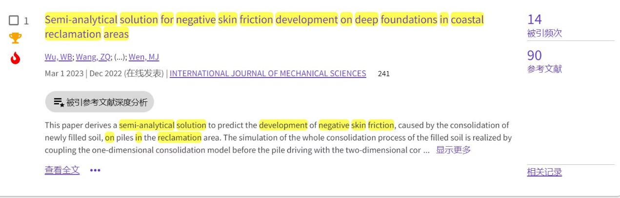 (通讯员 黄静)根据2023年7月基本科学指标数据库(Essential Science Indicators,简称ESI)最新数据显示,WilliamHill中文官网勘察与基础工程系吴文兵教授团队于2023年在国际工程力学领域权威期刊International Journal of Mechanical Sciences(IF: 7.3, 中科院一区TOP)上发表的学术论文“Semi-analytical solution for negative skin friction development on deep foundations in coastal reclamation areas”同时入选ESI热点论文和高被引论文。该论文第一作者为吴文兵教授,第二作者为勘察与基础工程系王宗琴硕士,威廉希尔WilliamHill(武汉)WilliamHill中文官网为第一署名单位。