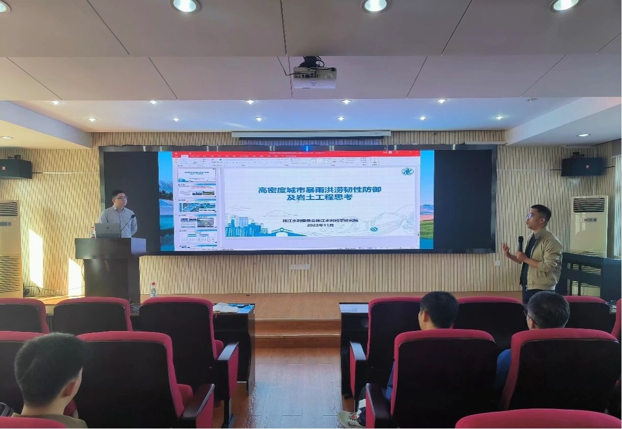 魏乾坤主任做了题为“高密度城市暴雨洪涝韧性防御及岩土工程思考” 的学术报告。他首先介绍了高密度城市暴雨洪涝灾害特征及成因,即我国高密度城市暴雨洪涝灾害损失大、突发性强、致灾快的基本特征。其次从暴雨产流、防御体系、城市基础设施三方面分析高密度城市暴雨洪涝灾害成因。魏乾坤主任总结了广州、深圳规划编制经验,结合 “城市海绵-市政小排水-水利大排水”耦合水文水动力模型,从目标、内涵、技术三大层次提出高密度城市暴雨洪涝治理理论。最后从工程、非工程体系两大角度提出高密度城市暴雨洪涝韧性防治对策。本次报告也指出从城市水利工程、岩土工程、工程地质、水文地质等多角度交叉融合探讨城市内涝问题的解决方案是城市防灾减灾的重要课题。