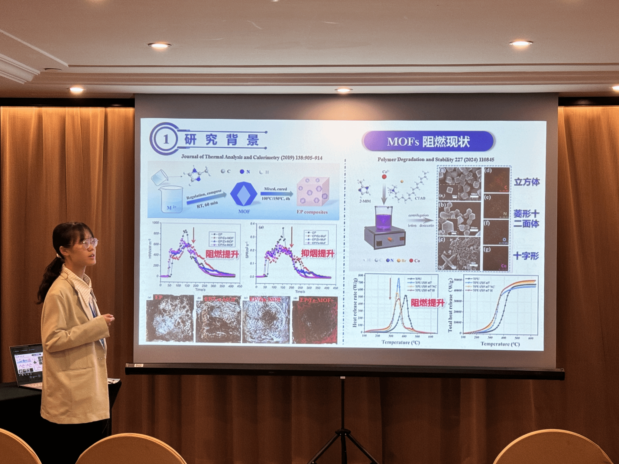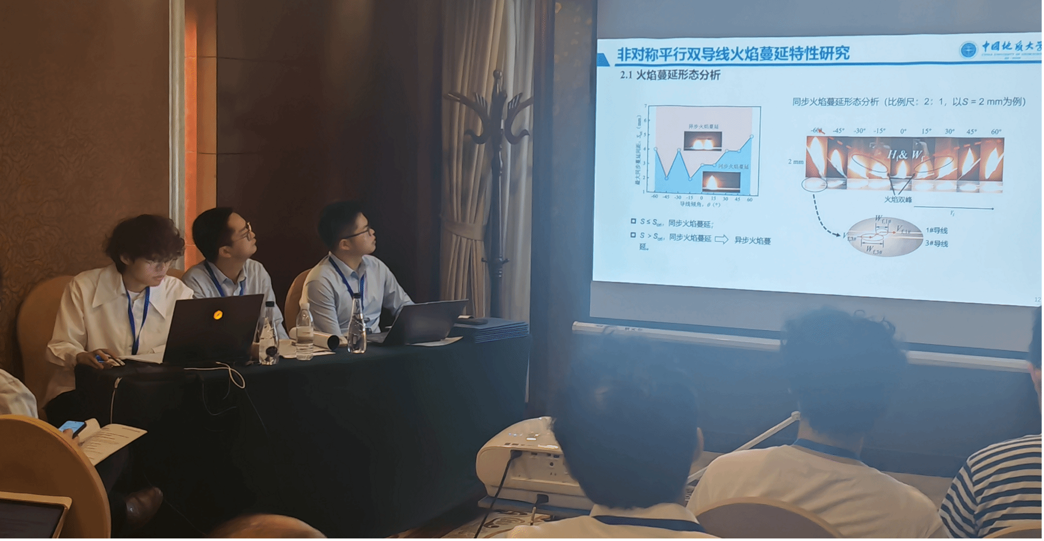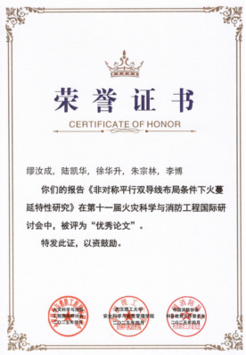 此外,公司研究生印恋在阻燃耐火论坛作题为“卟啉基有机框架衍生物分子设计及其阻燃增韧研究”报告、罗瑊瑊在阻燃耐火论坛作题为“生物启发微中空MOFs的界面锁定效应:环氧树脂复合材料的耐火与增韧性能优化研究”报告、缪汝成在火灾机理论坛作题为“非对称平行双导线布局条件下火蔓延特性研究”报告,孟祥龙在火灾烟气论坛作题为“空气幕射流作用下的开口溢流发展行为研究”报告,宗志伟在受限空间火灾论坛作题为“墙角型壁面限制条件下的火羽流行为特性研究”报告。其中,陆凯华副教授指导的硕士研究生缪汝成获得会议优秀论文奖。