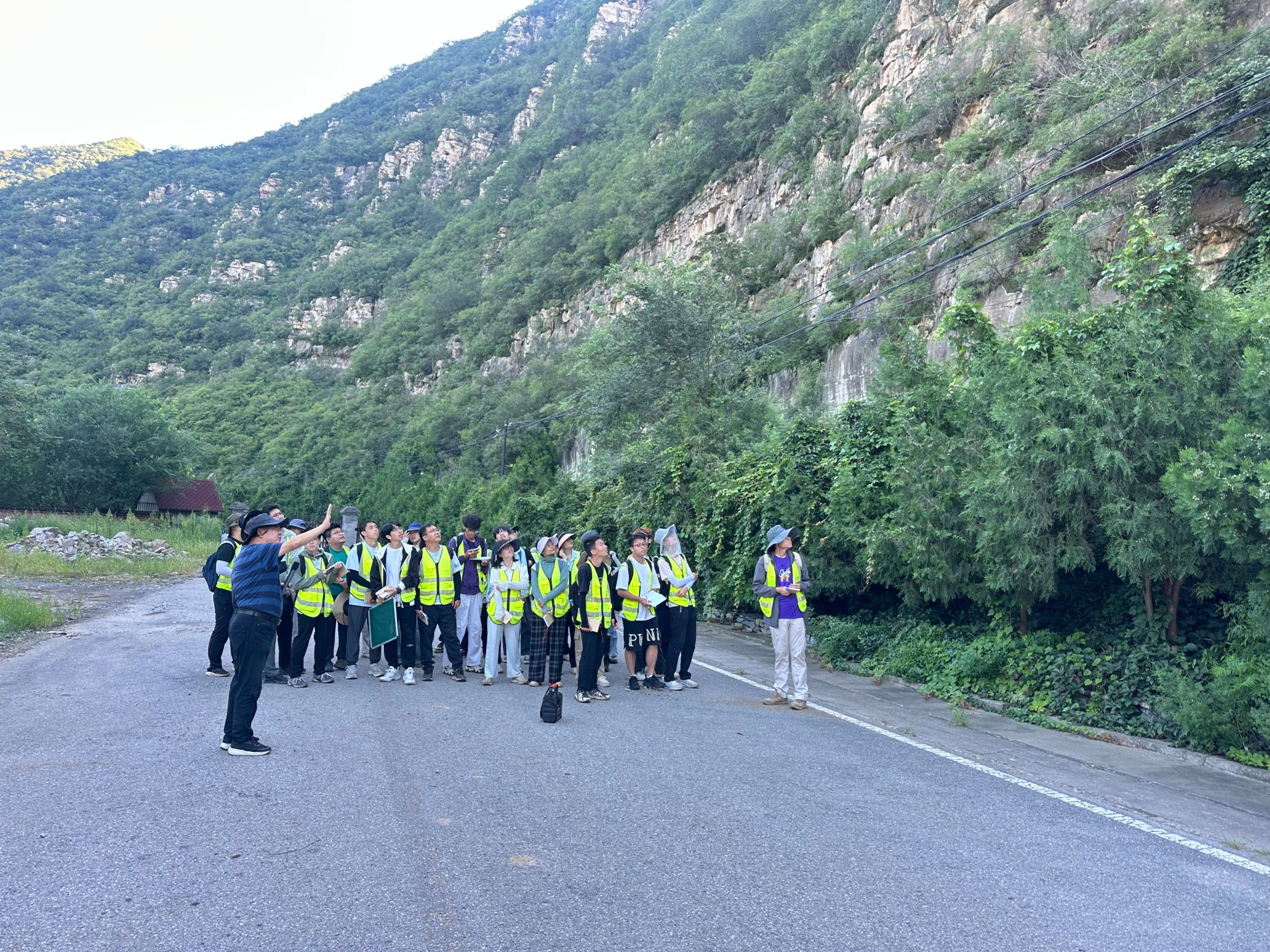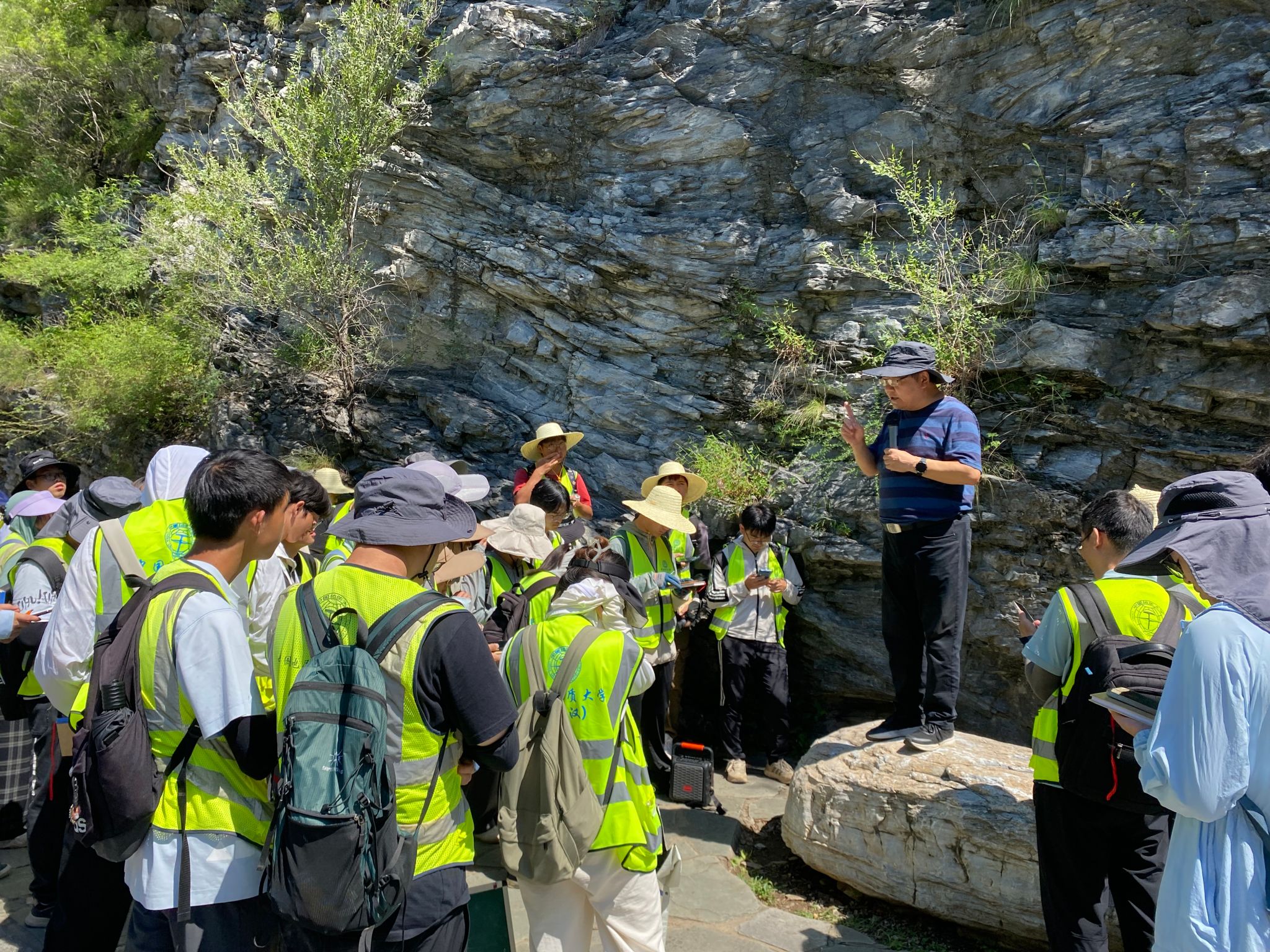 8月10日上午,王亮清一行与实习师生一同前往黄山店实习路线,全程参与野外实践教学。在陡峭的山路上,王亮清与师生共同观察地层构造、分析沉积环境,并结合典型地质现象现场讲解。王亮清强调,周口店实习是地质工程人才培养的关键环节,周口店这本天然教科书,需要以脚步丈量,更需要用创新思维解读。他对同学们提出三点期望:一是以实践锤炼本领,在野外观察中树立“将今论古”的演化思维;二是强化安全意识,通过复杂地质条件下的工程问题模拟训练,提升风险研判与处置能力;三是拥抱技术变革,积极运用AI地质罗盘等智能装备开展野外工作。他指出,作为公司历史最悠久的野外实践基地,周口店实习基地培养了大批优秀地质人才,被誉为“地质工作者的摇篮”,他勉励同学们传承“摇篮精神”,夯实专业基础,为服务国家地质事业积蓄力量。